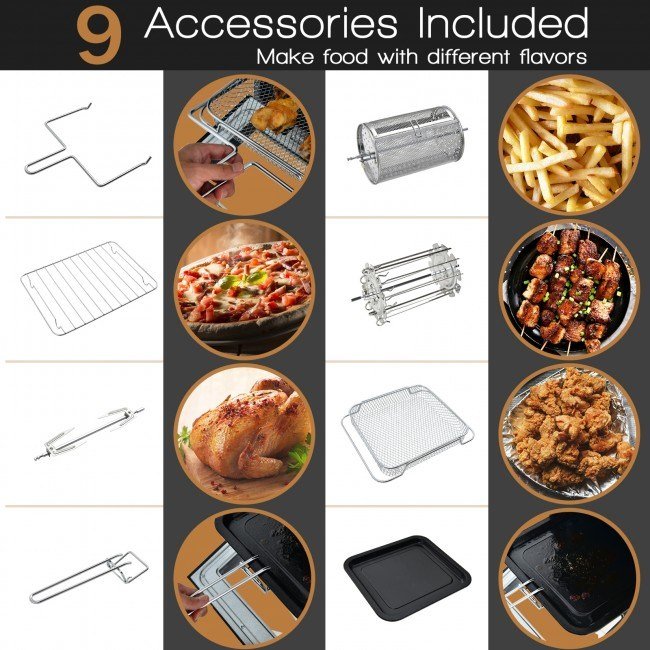 With 8 preset cooking menus; this air oven provides you with a variety of cooking options. And you can make chicken wings; french fries; pork; fish; poultry; drying fruit; bread and shrimp to fulfill your needs. The adjustable temperature(120°F-400°F); 1700W powerful motor and 360°rapid air circulation function cut fats while keeping the same great taste. Besides; the clear control panel allows you to adjust the cooking modes; temperature and time (1-60min) (dry fruit function for 12 hours) conveniently. 9 accessories in the package let you clean it with water and detergent.