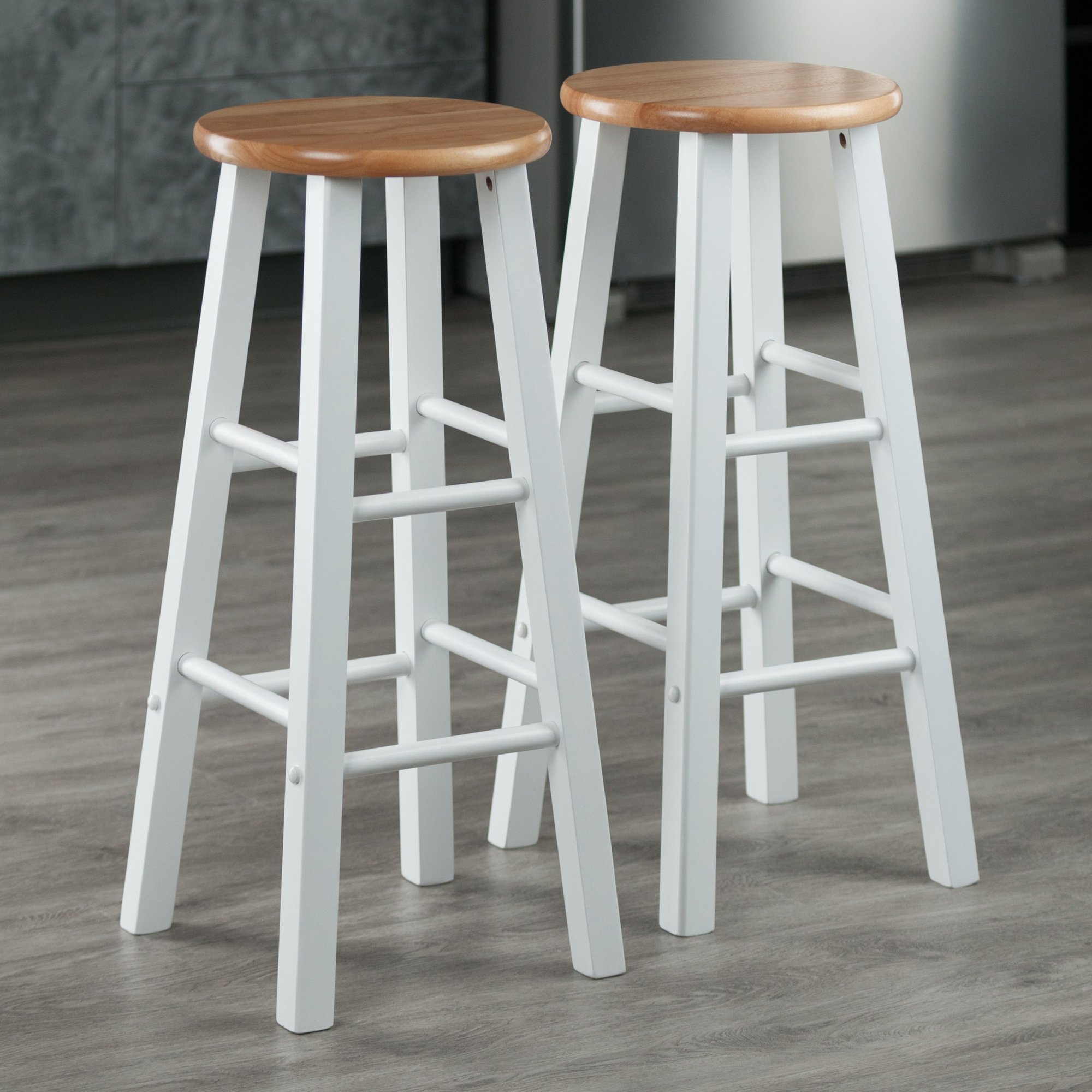 Spruce up your kitchen; breakfast nook; or den with this Winsome Wood Element Bar Stool Set. The seat is finished with a clear lacquer to highlight the natural wood grain and the frame is in a white; giving these classic stools a blend of modern and traditional design. Crafted from study solid wood these bar stools are designed to help you coordinate with a wide variety of furnishings. The square legs and round seat have a sturdy built offering a supportive foundation and hold a static weight of 220lbs. Featuring 8 crossbars; high and low on all four sides; for stability and strength while also serving as convenient footrests; making this stool not only functional but also comfortable. Ideal for extra seating; accommodating guests at gatherings and ideal for everyday use. These 13.58'W x 13.58'D can easily be tucked away when not in use. Like most Winsome stools; the Element collection is available in multiple finishes and like most Winsome stools are available in both bar and counter height. Conveniently packed and shipped in one box and are ready to use; as no assembly is required.