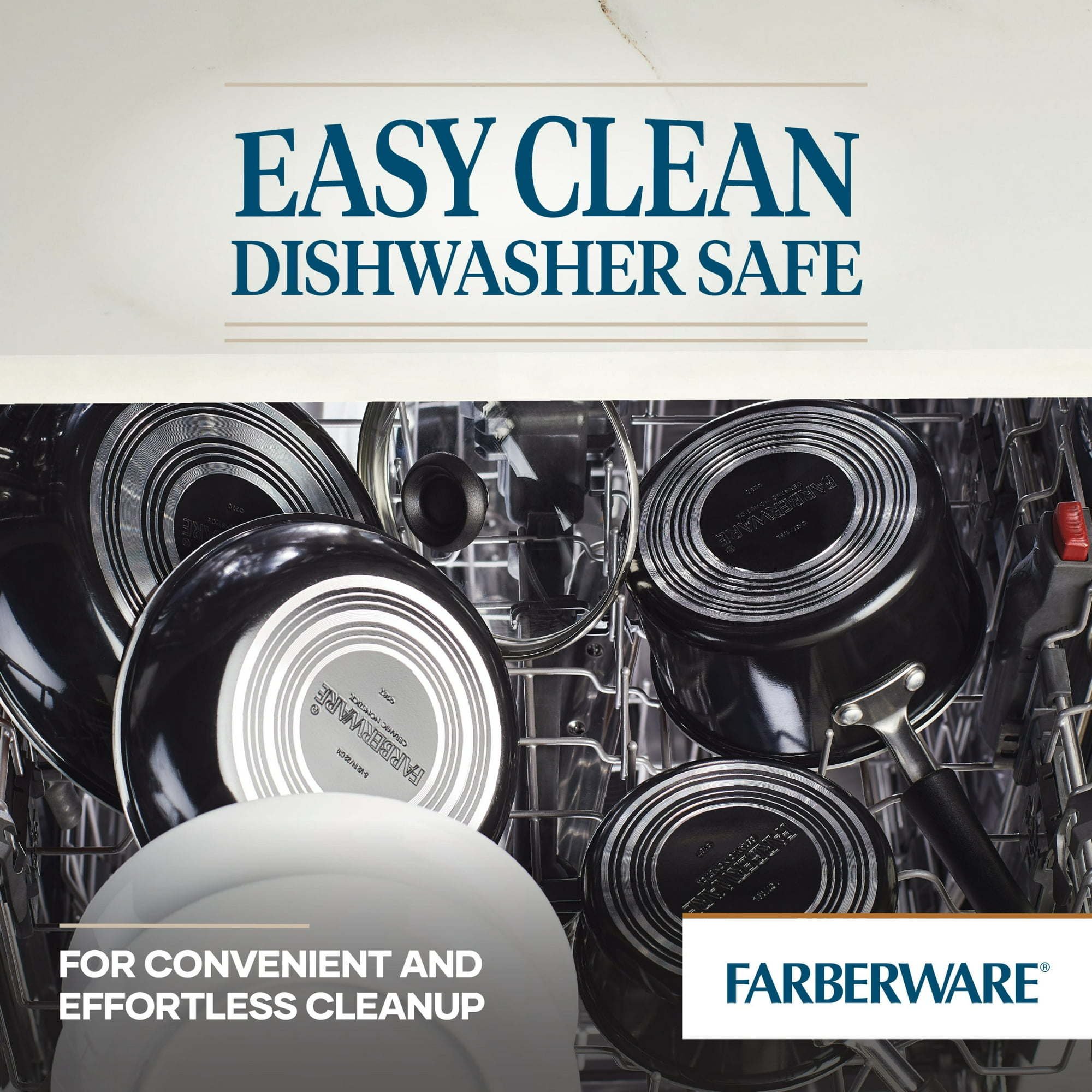 Move one pan meals around the kitchen with ease using the high performance, dishwasher safe Farberware Easy Clean Pro 12.5 inch Nonstick Skillet with a convenient helper handle. From a family sized cheese and spinach frittata to cooking up some weeknight pasta carbonara with fried prosciutto, the nonstick interior provides excellent food release and easy cleanup, and the aluminum construction helps to cook foods quickly and evenly. Since 1900, Farberware has brought performance, convenience, and reliability to countless kitchens at an affordable price. The Farberware Easy Clean Pro 12.5 inch Nonstick Skillet continues those traditions while improving upon them with new technology for today's busy cook. The cookware features top quality nonstick coating that's conveniently dishwasher safe, and the strong, double-riveted handle and helper handle provides a comfortable grip. The best part is that Farberware has added these technological advances without sacrificing convenience this skillet is oven safe to 350 F and dishwasher safe for swift and simple cleanup. For everyday performance with dishwasher safe convenience and premium quality nonstick, rely on the Farberware Easy Clean Pro 12.5 inch Nonstick Skillet with helper handle.