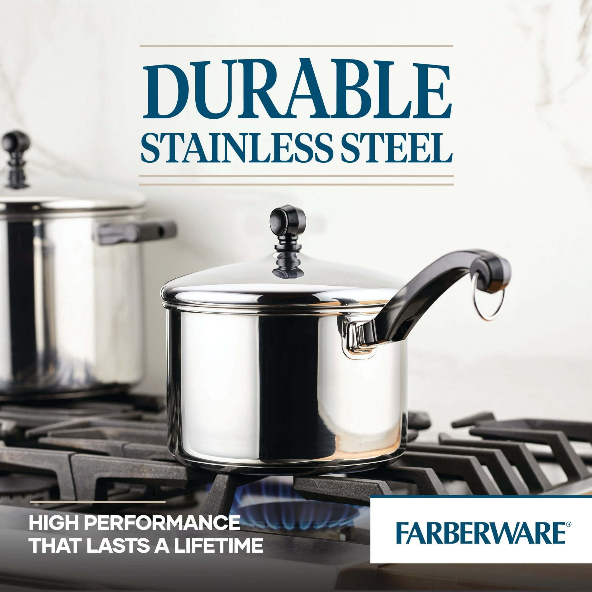 This Farberware Classic Series Stainless Steel 3-Quart Saucepan with Lid delivers classic elegance and long-lasting durability. Farberware has been trusted for over 100 years, and this saucepan continues that tradition for a new generation. A full cap base featuring a thick aluminum core surrounded by stainless steel provides rapid, even heating on any stovetop, including induction. Heavy-duty stainless steel is polished to a mirror finish for a classic touch, and the comfortable saucepan handle with iconic styling provides a confident grasp. Cooks will reach for this stainless steel saucepan again and again, whether simmering marinara sauce for a spaghetti dinner or whisking turkey gravy for a holiday feast. A self-basting stainless steel lid helps seal in heat and moisture, and this saucepan is dishwasher safe and oven safe to 350°F. Combine this saucepan with other Farberware Classic Series Stainless Steel pots and pans to create a great complementary look in the kitchen. Reach for the Farberware Classic Series Stainless Steel 3-Quart Saucepan with Lid for a go-to pan in the kitchen.