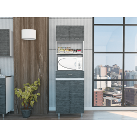 Auburn Microwave Pantry Cabinet; Two Cabinets; Two Open Shelves; One Drawer (Color: Smokey Oak / White)
