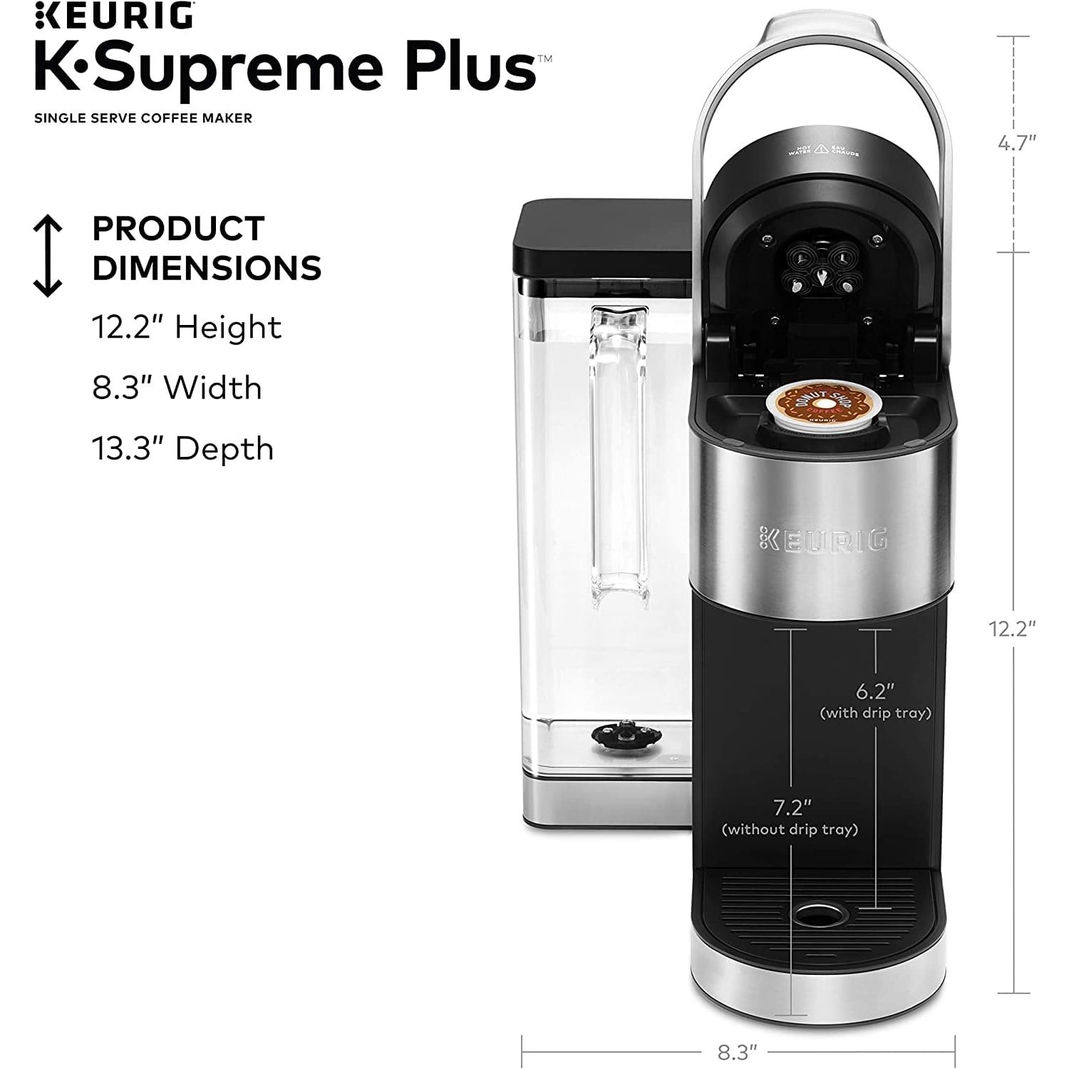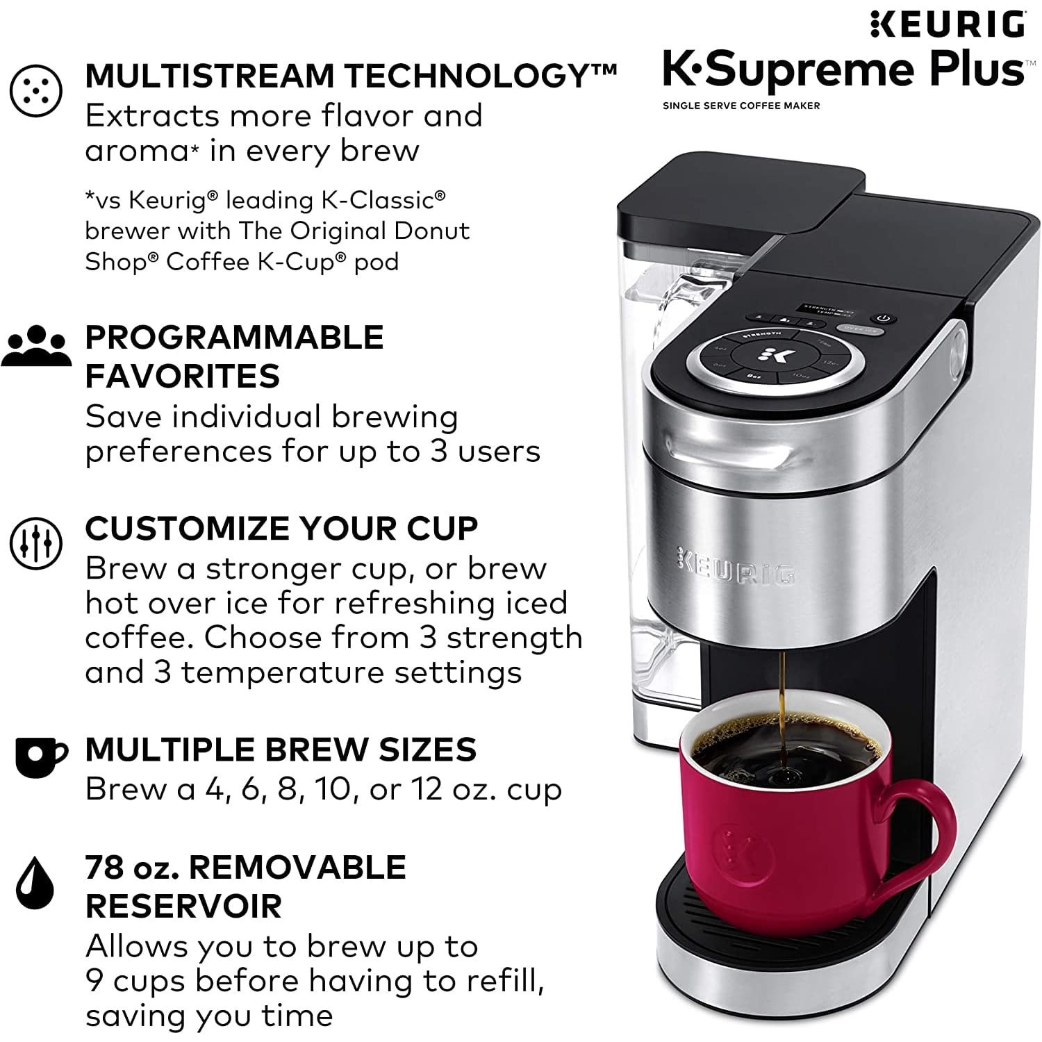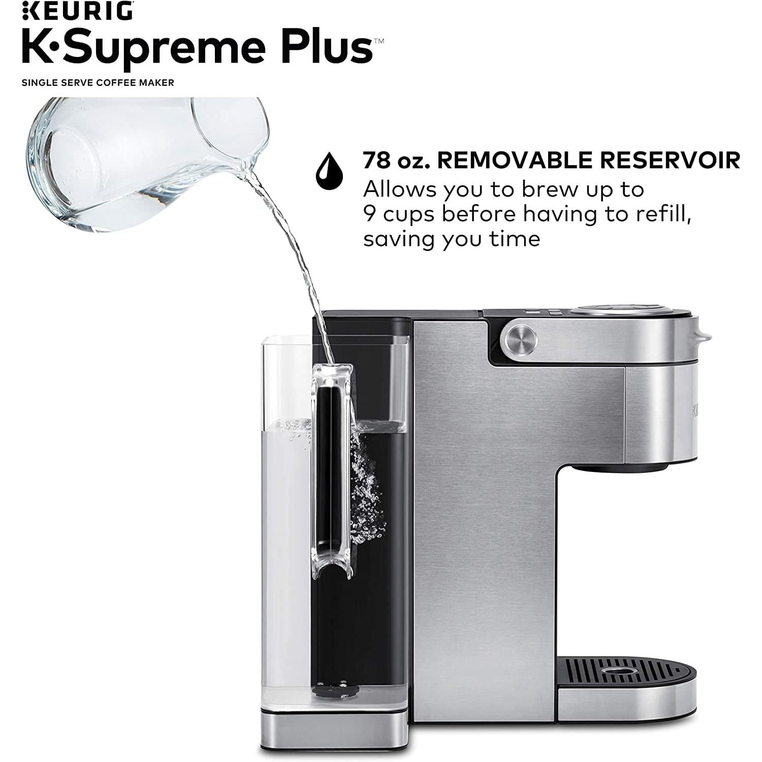 No matter how you brew; you can always enjoy 4; 6; 8; 10; or 12 oz. cups of your favorite coffee; tea; cocoa; and more – all freshly brewed in minutes. Choose from hundreds of delicious varieties of K-Cup pods or brew your own ground coffee with the My K-Cup Universal Reusable Coffee Filter (sold separately). The K-Supreme Plus coffee maker is travel mug friendly; and the large 78 oz. removable reservoir makes refilling a snap. And with a modern digital display screen and a sleek stainless-steel metal wrap; it's a striking standout in any kitchen.
