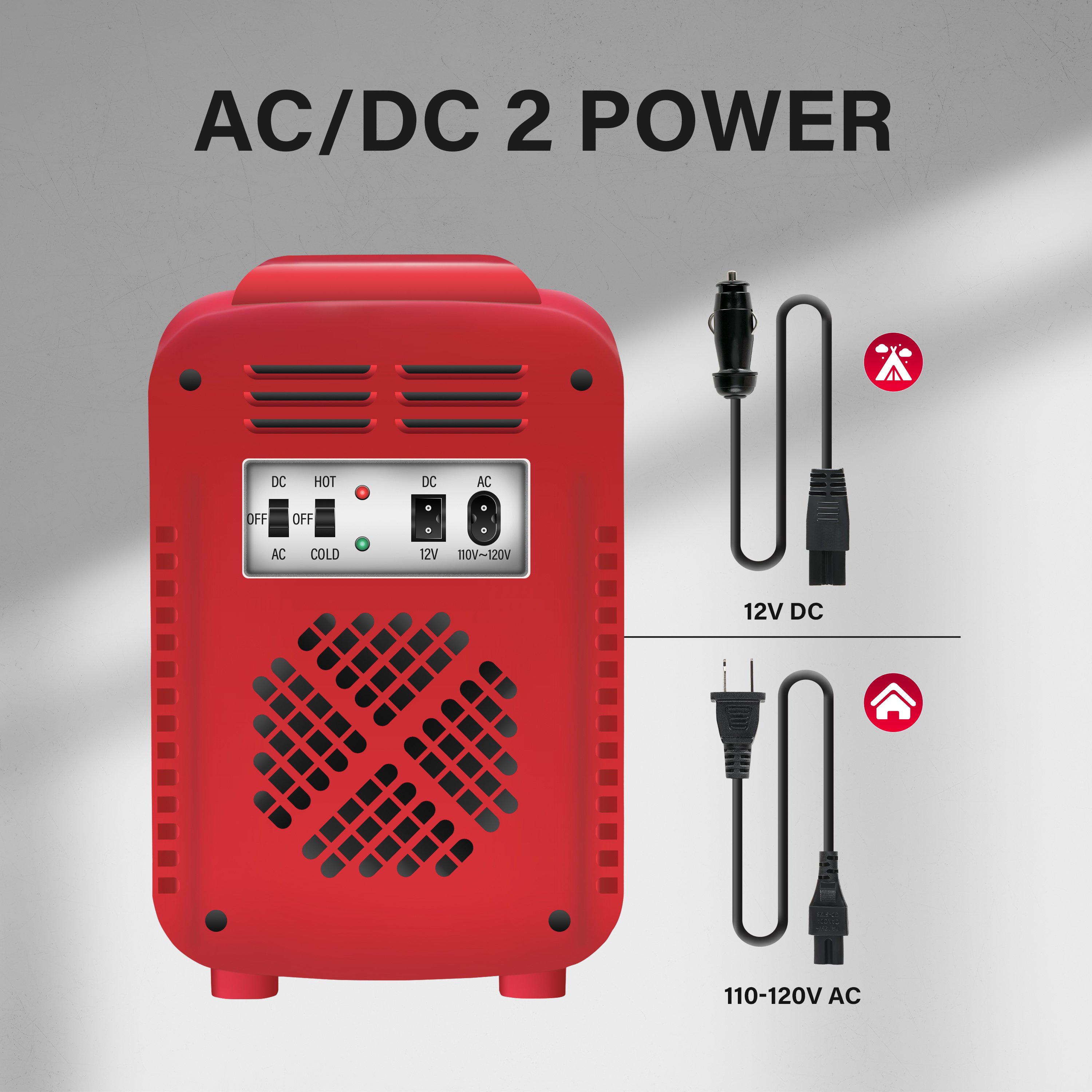 Compact and portable: 4-Liter capacity that can store up to six 12 oz cans. The interior size is 5.5*5.1*8.1 inches. Comes with a removable shelf and convenient carry handle, great for bedroom, offices, dorms, camping and more! Capacity: 4 liters Multiple functions: Set the mini fridge to cool or warm just flip a switch! Cool up to 34°F (18-20°C below ambient temperature) and keep warm up to 131°F (55°C), great for the storage food, drinks, cosmetics and skincare. An ideal gift for women Adapter: You can connect the fridge to a 100-120V home power supply, perfect for indoor and outdoor. Eco-friendly and quiet operation: 100% Freon-Free. Use advanced semiconductors that are free of CFCs and refrigerants. And the chips are more powerful, long-lasting durability and energy efficient. With the ability to perform quietly (25 dB Sleep Mode) Package include: 1*red mini refrigerator host, 2* power cord, 1*internal partition storage room shelf, 1*storage box, 1*English manual