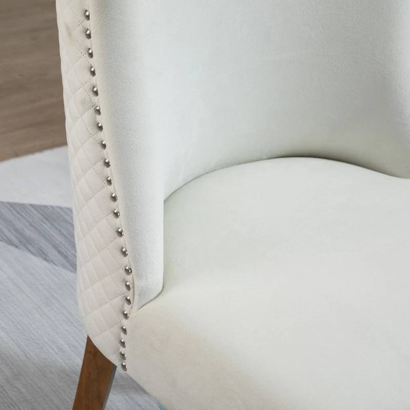 Create a stylish and cozy dining area with this White Modern High Back Nail Head Trim Upholstered Dining Chairs, Set of 2! Includes 2 chairs that can be used for having dinner, a conversation for two or accent chairs in your home. Chairs include a high backrest and wood legs for a modern and contemporary design that complements your home décor. Use in the kitchen, dining room, bedroom, office, and more. Sit back and sink into these upholstered accent chairs! The chairs covered with velvet-touch polyester fabric offer good breathability. Includes a high back and a sponge padding seat for added comfort and support while you lounge. The dining room chairs are suitable for daily use. All four legs are made with solid wood construction for a stable seating area.