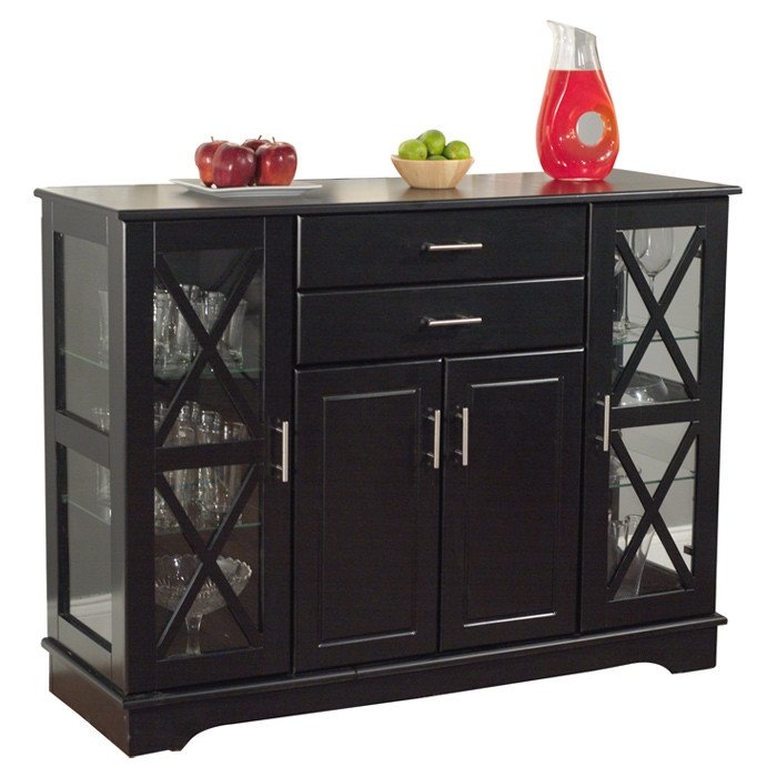Create more space in your dining room or living room with this Black Wood Buffet Dining-room Sideboard with Glass Doors that will match with any decor. This buffet offers both glass and solid doors a classic style. The X style door features two adjustable tempered glass shelves on each side.