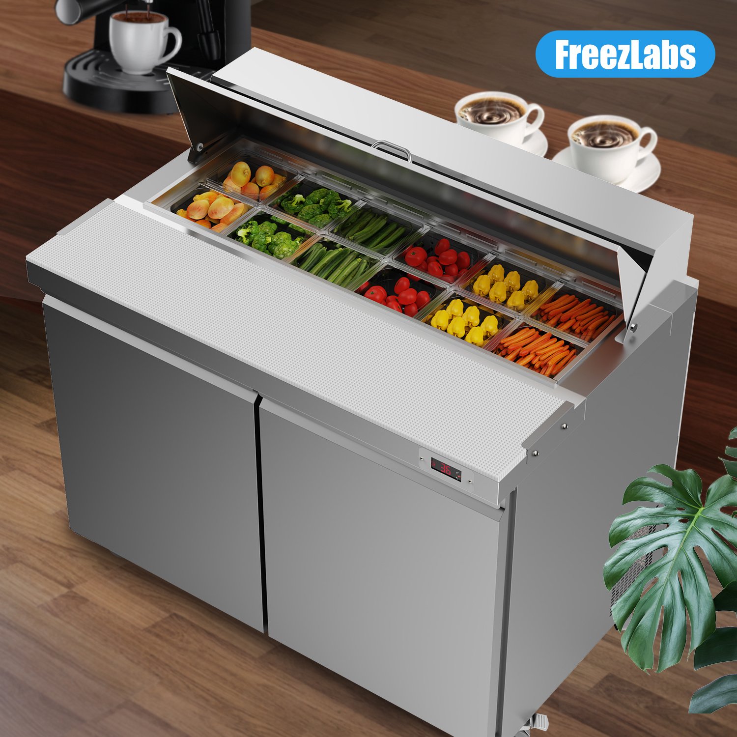 FreezLabs Sandwich Salad Prep Table includes food containers, a full-size cutting board, and a removable cutting board that meets NSF standards.